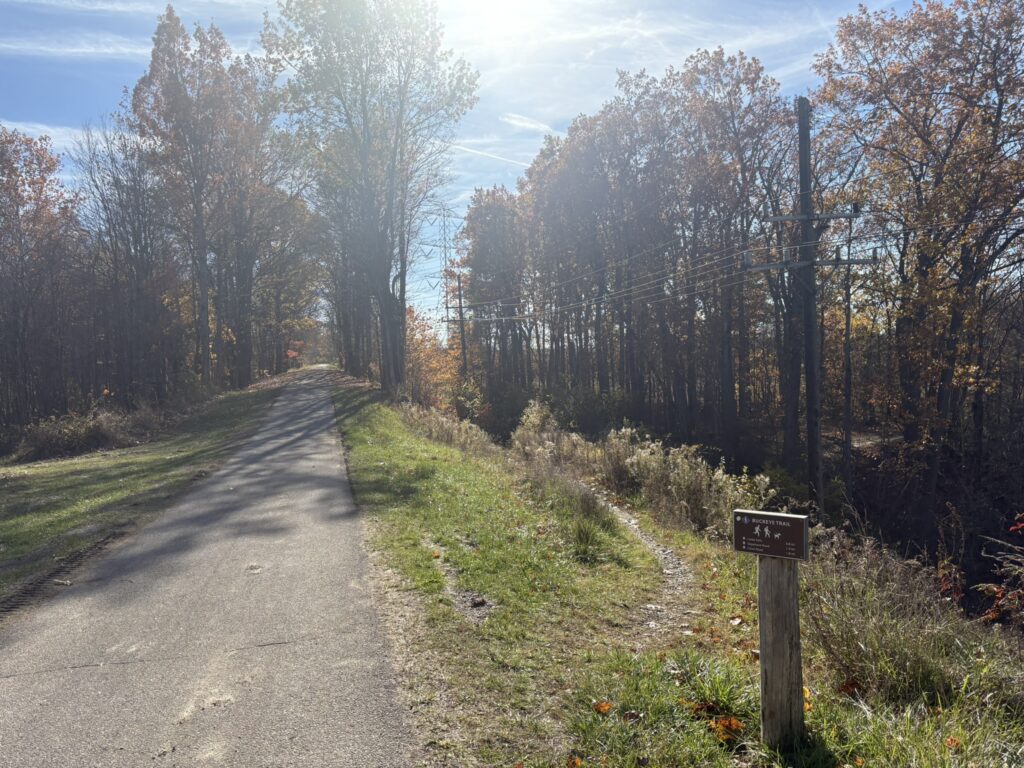 You will take the Buckeye Trail for approximately 2/3 mile. During this hike, you will be on a single path, dirt trail, for your entire journey. You’ll notice the trail weaves you in and out of a beautiful oak and maple forest that is picture-perfect in fall. If you want to take your time or need a break, there are several benches to sit on. If you want to further explore the trail, you’ll notice several rock formations slightly below that you can visit.